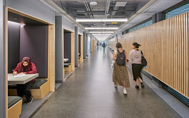 Previously featureless and locker-lined corridors now integrate workstation nooks, power bars, booths, and benches to provide students with more study, social and peer-to-peer interaction spaces for individuals, pairs and groups of diverse sizes and needs, and terminate at entrances with expanded canopies, visibility, and accessibility.